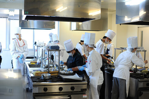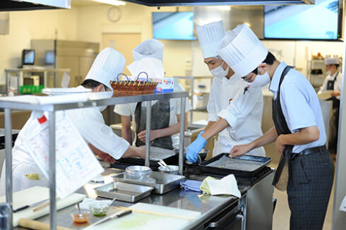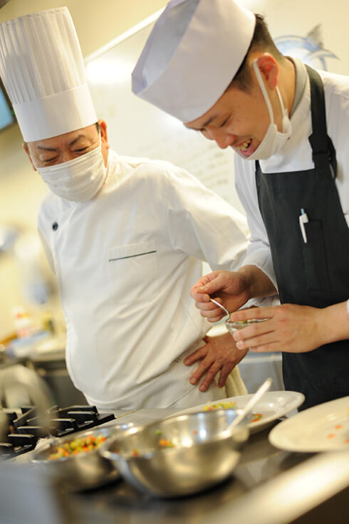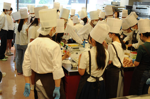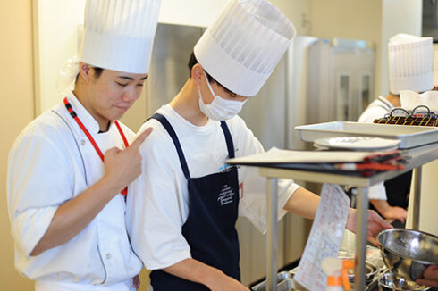 ネイビーのエプロンはOC3回以上参加の証。有名ホテルに内定が決まっている先輩も認める調理技術。