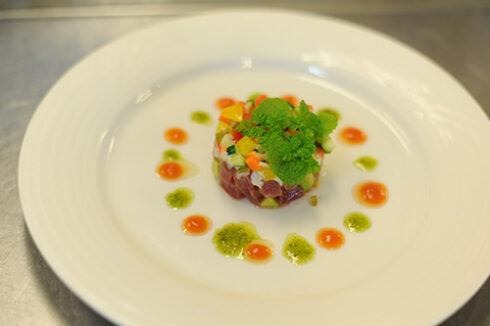 高度調理学科もホテルで振る舞われるようなメニュー!「マグロのタルタル」と「チュイル」三原先生と山本先生の担当でございます。
