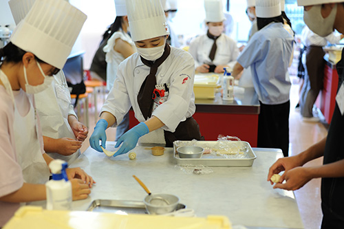 先生もしっかり見てくれます。(1年生の後期から製パン実習がスタート)