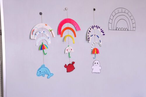 紙皿とタコ糸を使って、壁面や天井など、色々なところに飾れる飾りを作りました。