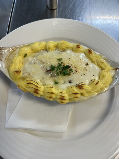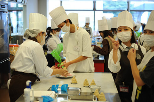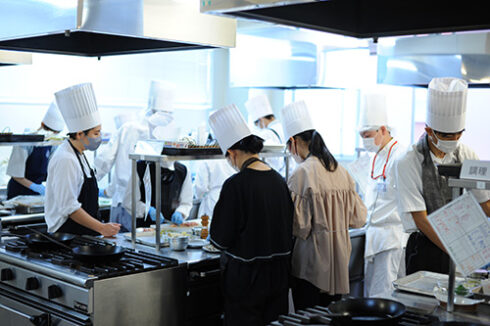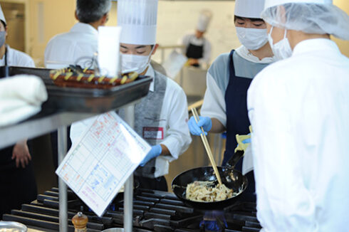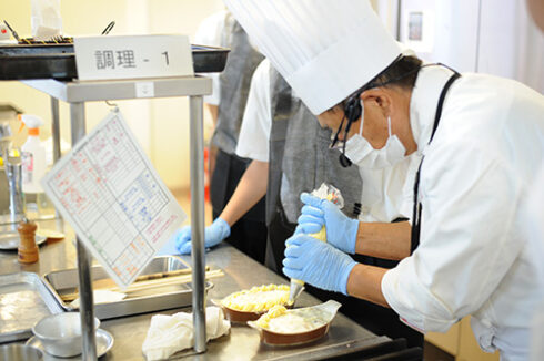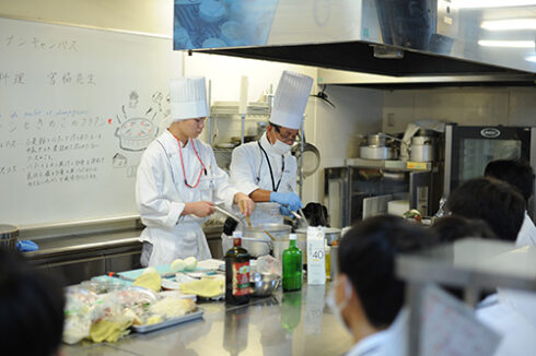 続いては高度調理学科。本日は季節のきのこグラタン。宮脇先生の横で先輩もお手伝いしています。