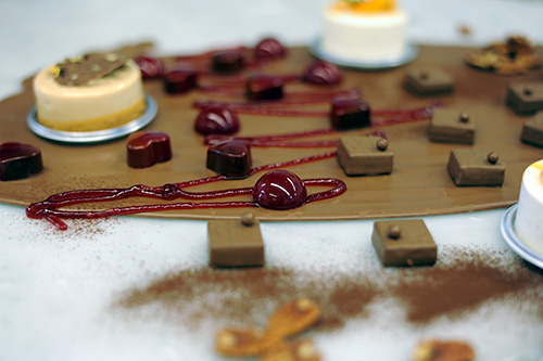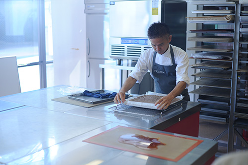 色を付けるのに、エアブラシを使用する鍋田シェフ。色の勉強も非常に大切。
