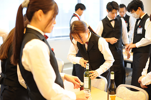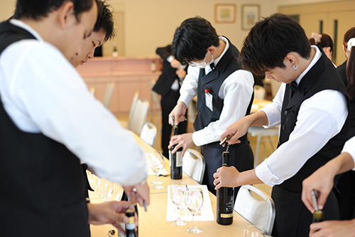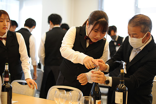 今回は西洋料理専攻の学生がサービスの実習を。(日本料理専攻は実習をしていました)作る人と食べる人の間に居る「提供する人」に関するスキルを学ぶことができる本授業。テーブルセッティングや料理の提供を学び、今回はワインの開栓を実習しました!