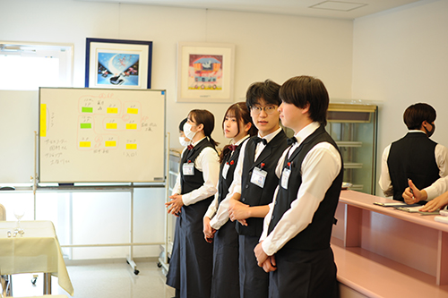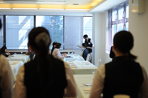 西洋料理専攻の学生がキッチンとサービスに分かれて実習し、こちらはサービスメンバーの打ち合わせ。