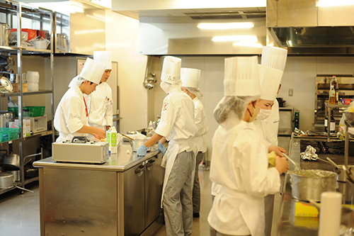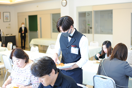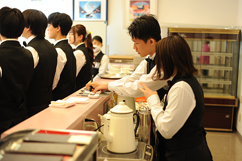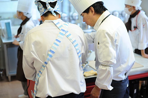 先生がお客様でも緊張感を持ってサービスを。ただ作るだけでなく、料理人としての心構えも学びます。