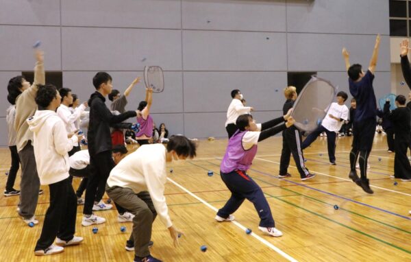 攻撃・守備・捕手にわかれてボールをかごに多く入れたほうが勝ち!という珍しいルール。