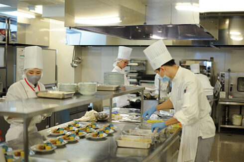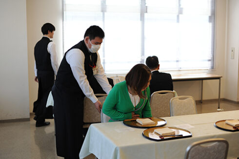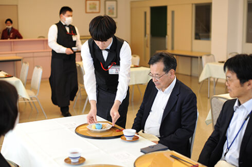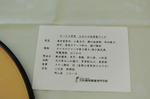 本日は日本料理のメニュー。日本料理専攻の学生が調理班とサービス班にわかれて先生方をおもてなし。予約時間を前に緊張の面持ちのサービス担当。