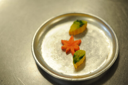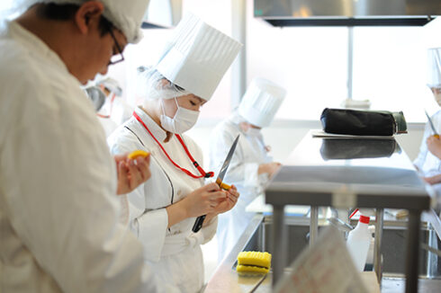 続いて飾り切りの実習。かぼちゃを葉の形に切るというもので、先生のレクチャーを受けて皆真剣に取り組んでいました。