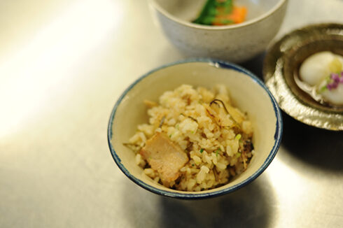 炊きあがったご飯に、醤油を少し混ぜて、フライパンの具材と合わせます。