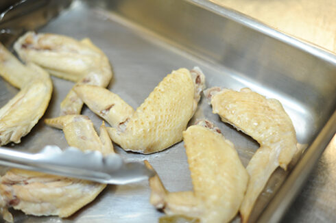 デモのあとは班に分かれて実習。手羽先の出汁の取り方からコツを紹介。