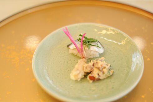 前菜:ツナシの小袖寿司、はじかみ巻き揚げ、紅葉人参白和え(干し柿)