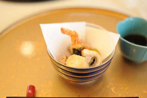 油物:みの揚げ、太刀魚げっかん揚げ、海老芋含め煮唐揚げ、揚げ銀杏、天出し