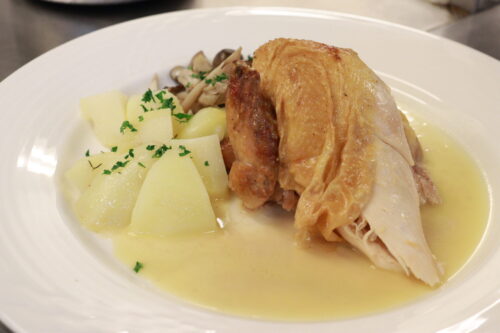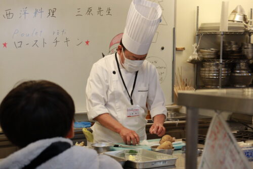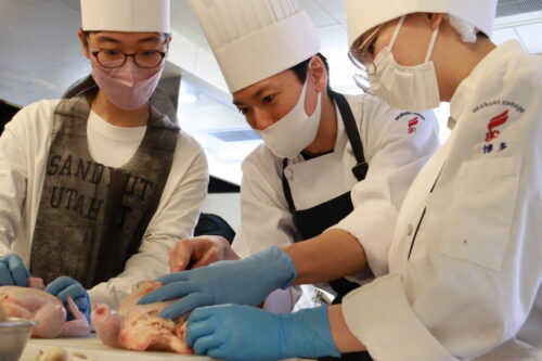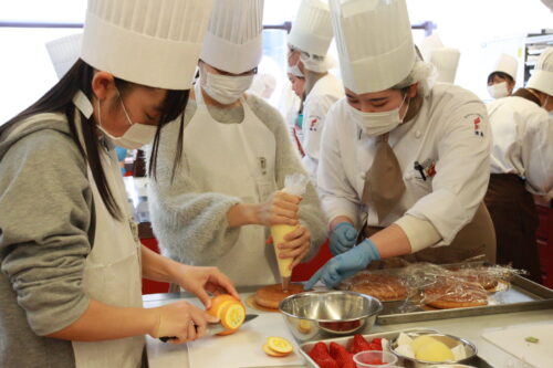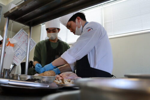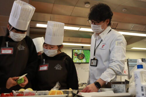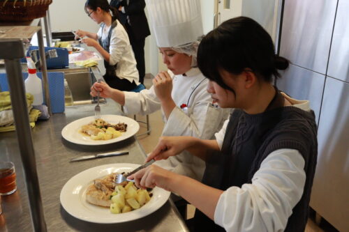 デモンストレーション後はそれぞれの班で先生や先輩も手伝ってもらいながら、フルーツタルトとローストチキンを作り上げました!