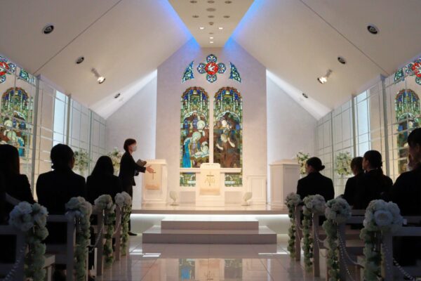 一際目を惹くステンドグラスや、音楽と連動して変化するチャペル内の照明など設備の説明をしていただきました。