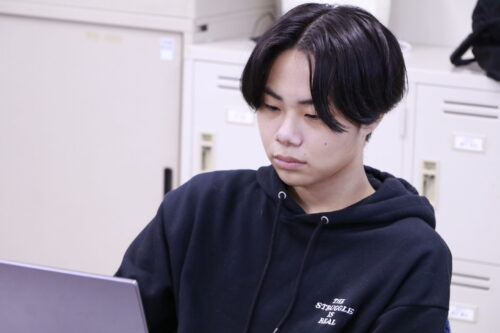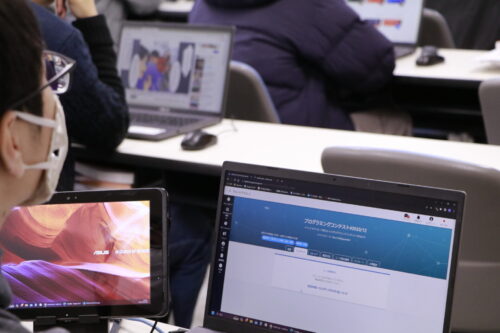 情報システム学科2年生と1年生が参加し、使える言語は、Java PHP Python JavaScript・・・といろいろあり、それぞれ自分自身が得意な言語を使ってプログラミングしていきます。