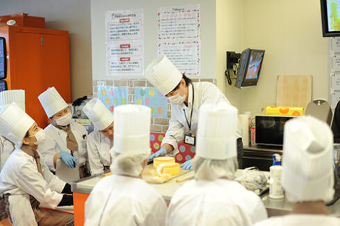 パティシエ・ベーカリー学科は1年生。ショートケーキの実習を高橋先生が担当。
