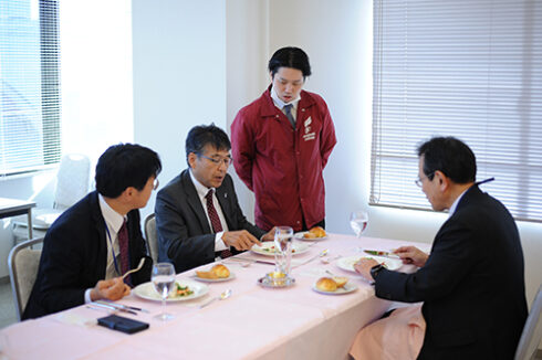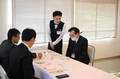 先生方を案内し、料理説明、ドリンクの希望を聞きます。サービスの実習着も毎回着ていると、着こなせてきます。(スーツと一緒ですね)