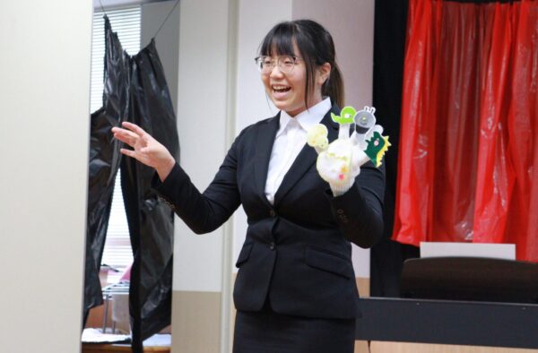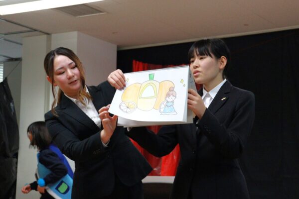 また、プログラムの合間にはスケッチブックシアターや手袋シアターなど自分たちで製作した教材を使ったシアター遊びを披露しました。
