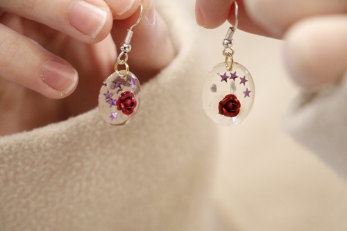 レジンが固まって、ピアス・イヤリングの金具を取り付けたら完成です!