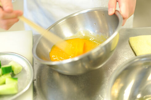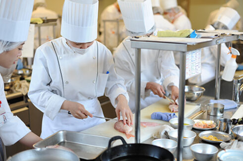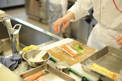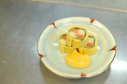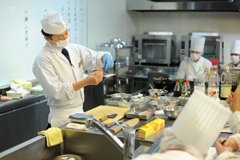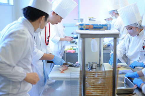 本日の午前中、高度調理学科 1年生を対象とした特別授業しました!講師として福山ニューキャッスルホテル和食堂鞆の浦 より永井料理長をお招きし、「サーモンと長芋の錦糸巻き」と「小鯛三色揚げ」を実演いただきました!