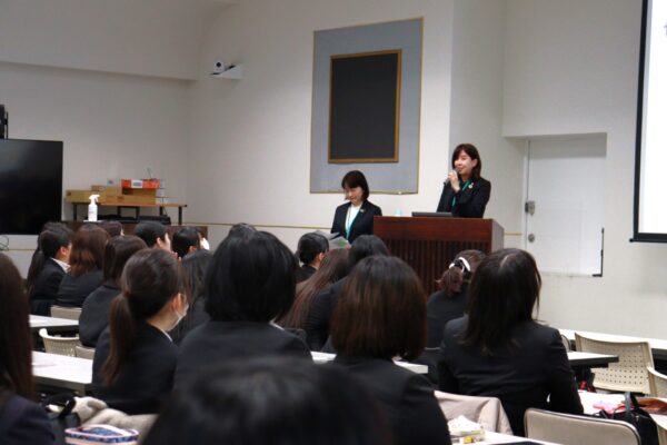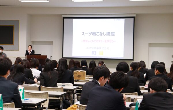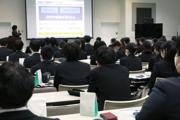 外部の講師の方に社会人としてのマナーや身だしなみの大切さを教えていただき、スーツの着こなしやメイクを学びました。