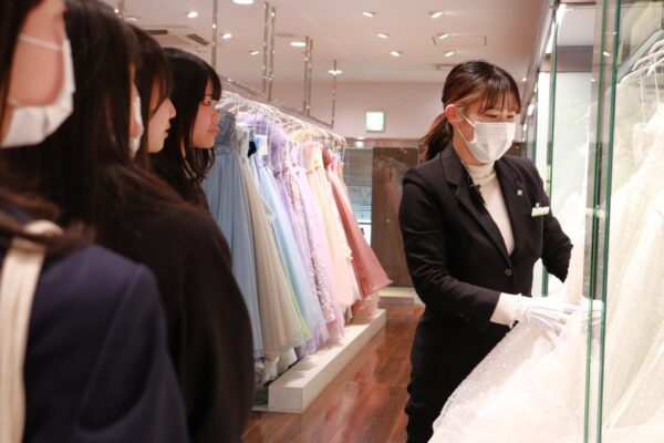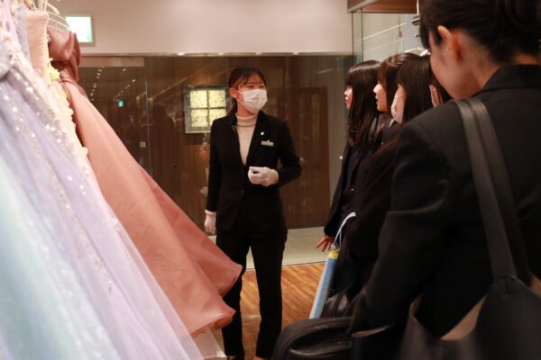 また、ウェディングドレスやカラードレス・タキシードがズラッと並ぶ衣装室を見学し、流行りの色やドレスの形の違いなども教えていただきました!
