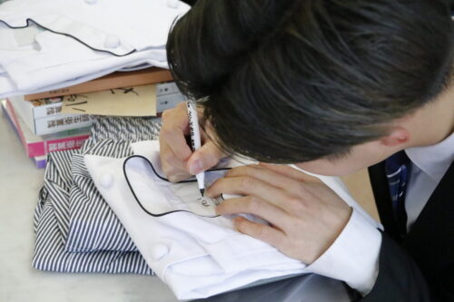 その後はコックコートやズボン・教科書にネーム入れを行いました!