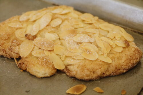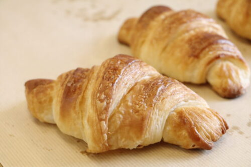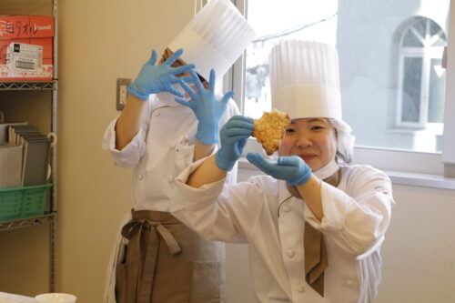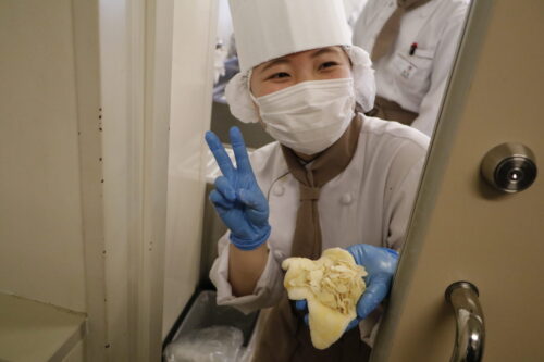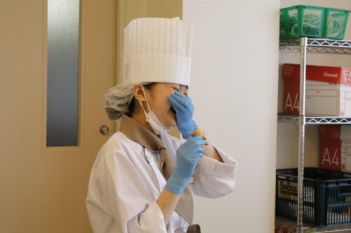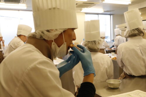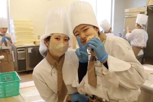 高度調理学科2年生が特別授業をしている隣では、パティシエ・ベーカリー学科2年生の製菓実習! 本日はパンの実習です!何を作ったのかというと「クロワッサン」 クロワッサンの生地をとアーモンドを使ったお菓子も! バターの香りが実習室いっぱいに!どれも美味しそうでした! できたてのパンも試食します!おいしいー!と大きな声がたくさんあがっていました! 美味しいものを食べているときの、幸せそうな顔をぜひごらんください! まぁ、顔隠していますが。。 美味しいものを食べて喜んでいる姿を見ると、こっちまで幸せな気持ちになります!!これが、パティシエの仕事の魅力でしょう! 次の実習の更新もお楽しみに!