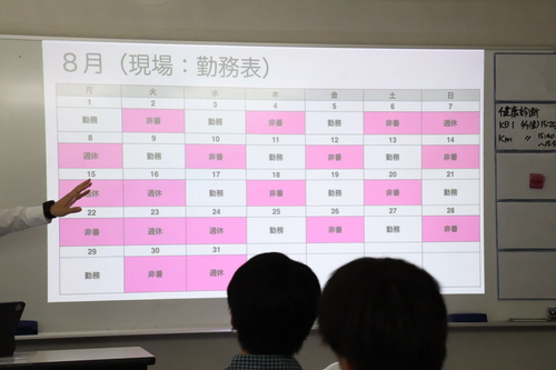 勤務表を確認して休日(赤)の多さに驚く学生たち。