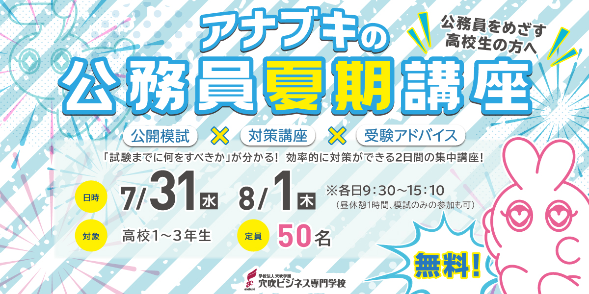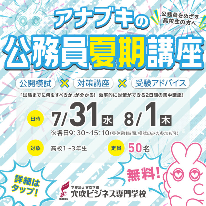 毎年、多くの公務員をめざす高校生に参加いただいている「アナブキの公務員試験対策 夏期講座」を今年も開催します。