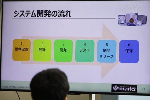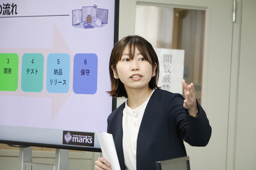 システム開発には多くの工程がありますが、マークスでは入社後2ヵ月間は新人研修にて、ビジネスマナーからIT基礎知識まで幅広い研修を受けることができます。