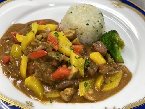 今日のオーキャンはビーフストロガノフ作りました! このビーフストロガノフですが、ロシアの郷土料理なんです。 名前だけだと「なんか難しそう・・。」と思うかもしれませんが、実は結構簡単に作れるみたいです! バターライスもオシャレに盛り付けましたよ! 参加した皆さんも、「家でも作れそう!」との感想があったので、レシピをみてぜひチャレンジしてみてくださいね!