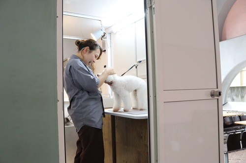 当校の卒業生で尾道でトリミングサロンを経営する中村さんが、新しいサービスとして移動式のトリミングカーを導入!