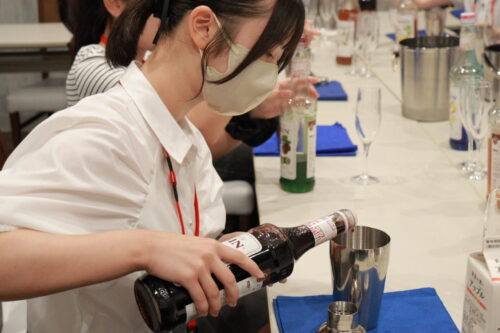 バーテンダーの方がカクテルを作るときに使う容器、シェイカーを実際に触ってもらいました。