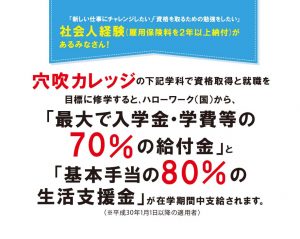 穴吹カレッジの対象学科で資格取得と就職を目標に修学すると、ハローワーク(国)から、「最大で入学金・学費等の70%の給付金」と「基本手当の80%の生活支援金」が在学期間中支給されます。