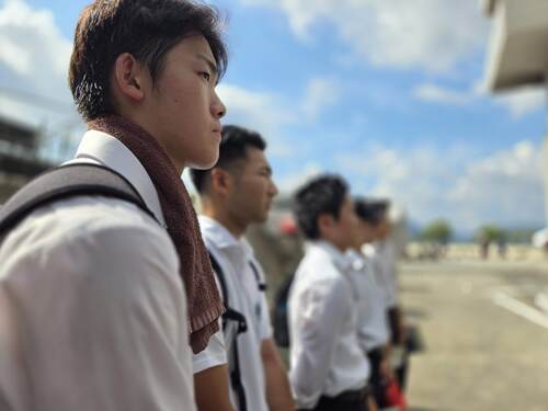 35度を超える猛暑の中で行われる厳しい訓練を目の当たりにした学生たち。