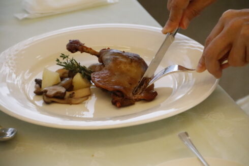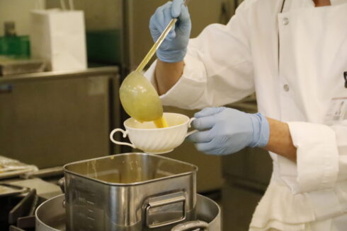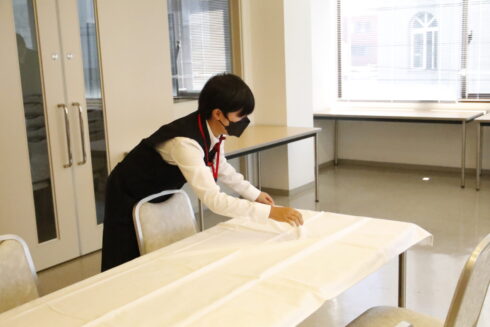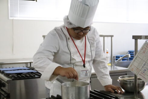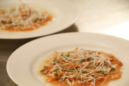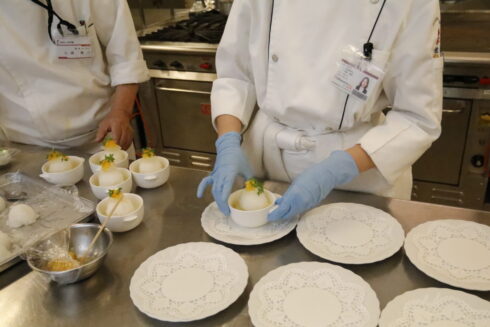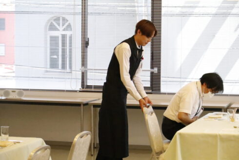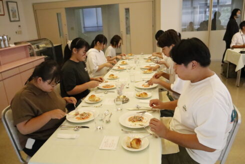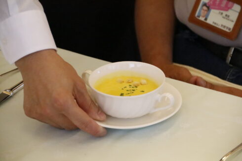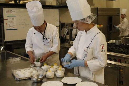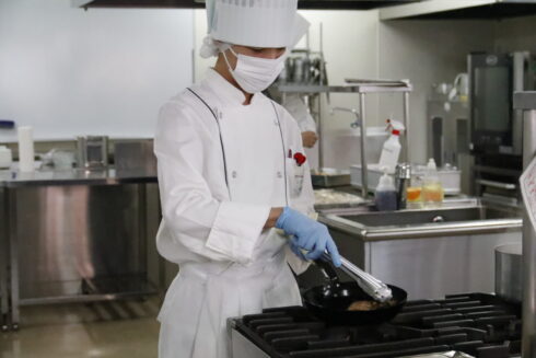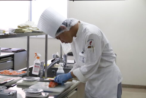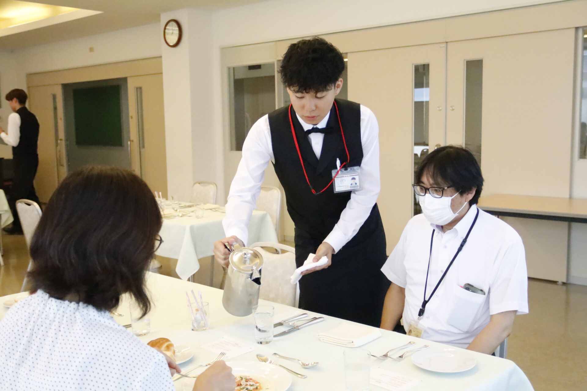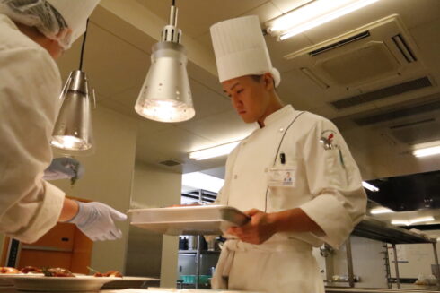 高度調理学科2年生の喫食実習がスタートしました。教職員も楽しみに待っていた喫食実習! まずは、朝一から仕込み開始。今回は西洋料理専攻チームです。 レストラン会場のレイアウトも自分たちで! 今日のメニューは! サーモンのカルパッチョ コーンポタージュ 鴨骨付き肉のコンフィ リンゴのコンポートとグラニテ サービスもお客さんのことをしっかりと考えて、落ち着いてできていました。 料理の仕上げも大忙しでしたが、連携してしっかりと提供できていましたね! 後輩たちも先輩の料理に感動の様子でした! 西洋料理専攻のみなさん、お疲れさまでした! 次回は日本料理専攻の学生の出番です! お楽しみに!