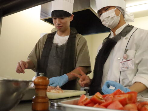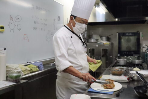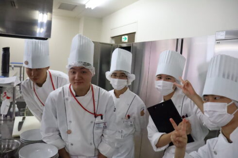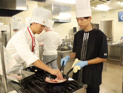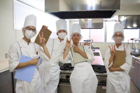高度調理のオーキャンは「鶏モモ肉のワインビネガー煮」! ワインビネガー煮ってあまり聞きなれないものかもしれませんが、フランス料理ではおなじみの料理です。担当は三原先生! トマトベースもおいしいみたいですね! 参加してくれた高校生は在校生と一緒にこの料理に挑戦。 在校生さすがですね、要所要所できちんとヘルプしてくれたので、手際よく進めることができました! 結構ボリューミーだったみたいですが、完成した料理はとてもおいしかったようです♬ 次回はイタリアンの定番!?マルゲリータピッツァを作ります。生地の成型から焼き上げまで、美味しいピッツァを作って食べてみましょう!