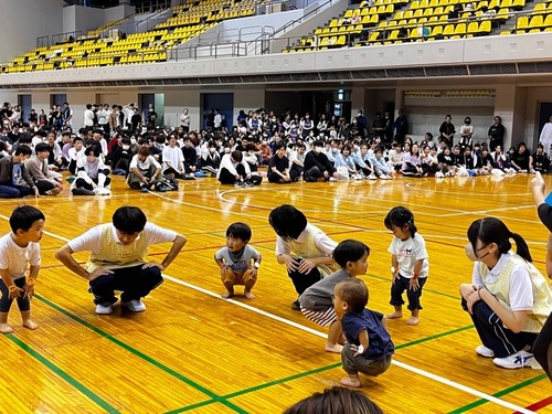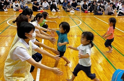 まずはあなかれほいくえんの園児たちのかけっことダンスを学生たちが見守ります。