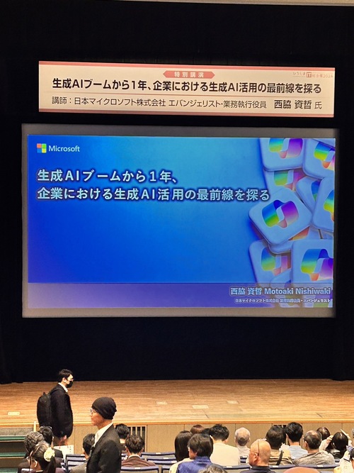 日本マイクロソフト株式会社のエバンジェリスト、西脇氏による「生成AIブームから1年、企業における生成AI活用の最前線を探る」という講演に、学生たちは熱心に耳を傾けました。