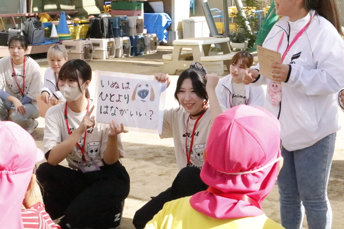 わんちゃんとの正しいふれあいをレクチャー。園児たちが楽しんで学べるように学生の工夫が光ります。