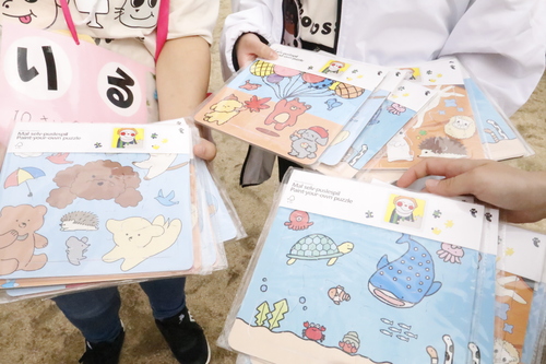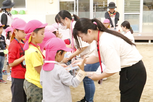 園児たちのお名前の手作り名札を作っていた学生たち。お名前をひとりひとり呼んで名札をプレゼント!