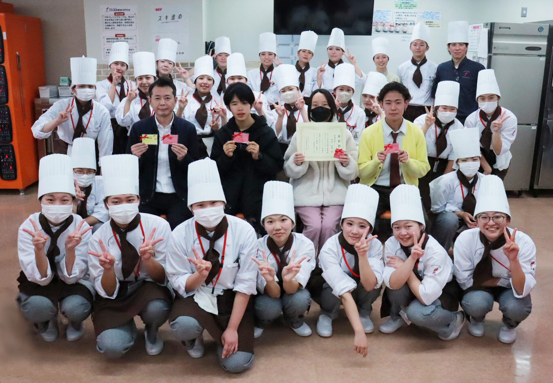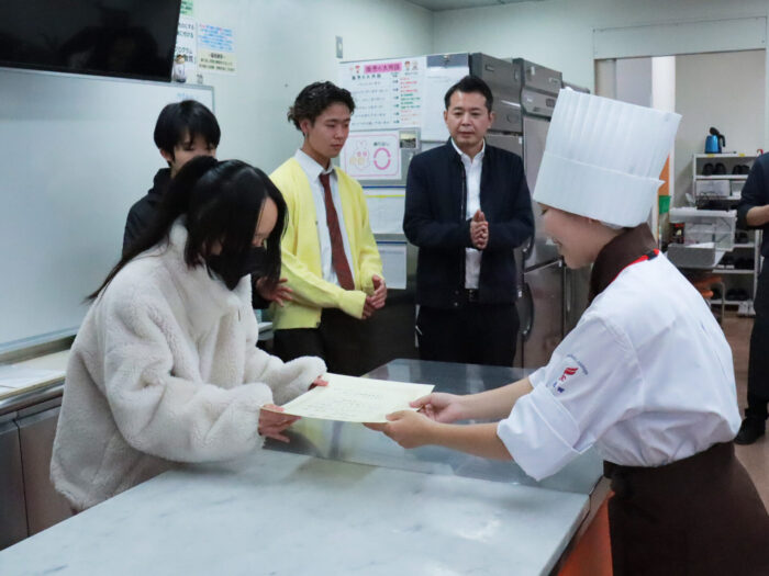 表彰式はパティシエ・ベーカリー学科の先生と学生(1年生)勢揃いで、