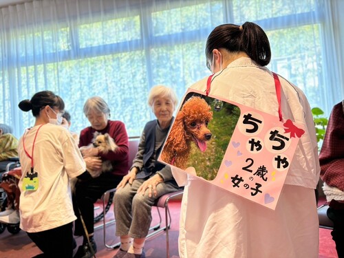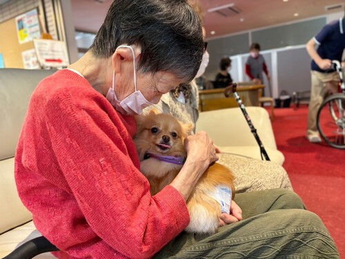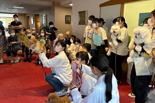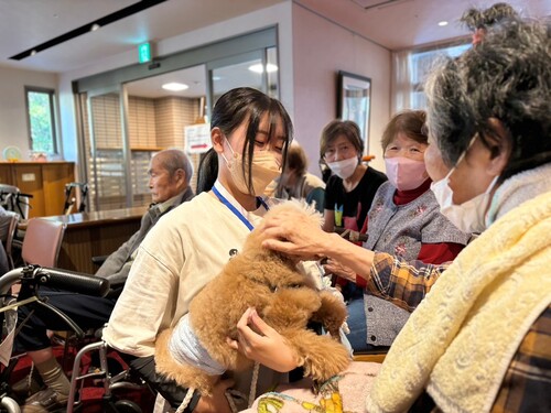 動物看護総合学科では介護施設や幼稚園などに出向き、 動物とのふれあいを通じ、人と動物の関わり方、QOL( 生活の質)の向上を目的として、アニマルセラピーの一種である AAA(Animal Assisted Activity:動物介在活動)実習を行っています。