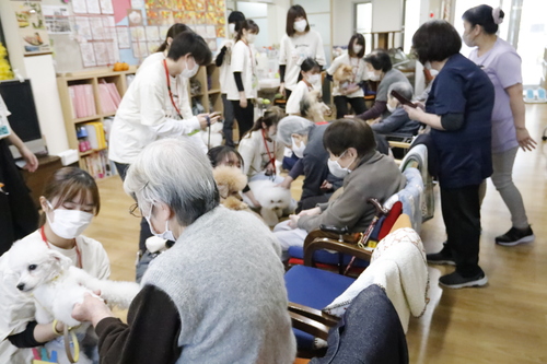 動物看護総合学科では、介護施設や保育園などに出向き、 動物とのふれあいを通じ、人と動物の関わり方、QOL( 生活の質)の向上を目的として、アニマルセラピーの一種である AAA(Animal Assisted Activity:動物介在活動)実習を行っています。