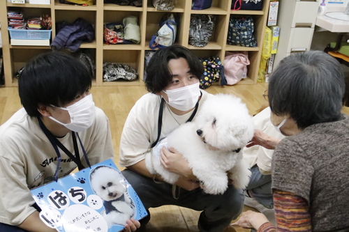 動物好きな利用者さんも多く、昔飼っていたわんちゃんのお話をしてくれたり、「いいこだね」と優しくなでてくれたり、とても喜んでいただけました。