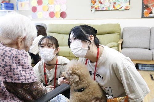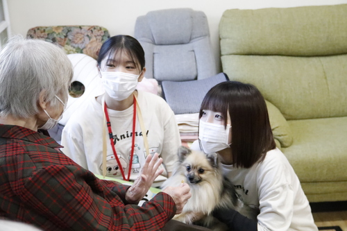 学生達は利用者様とおしゃべりしながらスタッフ犬とのふれあいをサポートします。