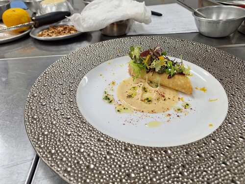 サフラン香るヴァンブランソースとレッドチェリートマトのコンフィ