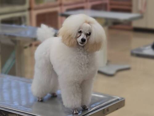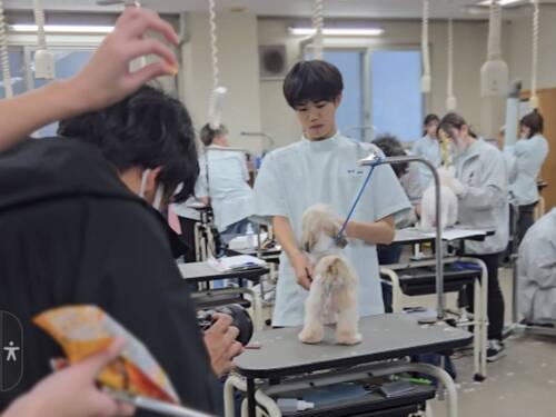 トリミング実習室では、動物健康美容学科の学生たちがスタッフ犬たちとともに撮影に挑戦。