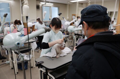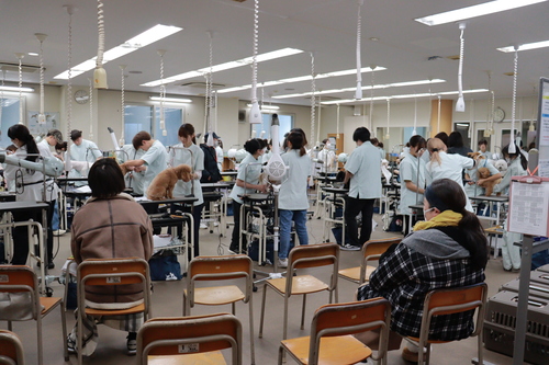今日はトリマーをめざす動物健康美容学科の授業を保護者の方へ開放する1日。